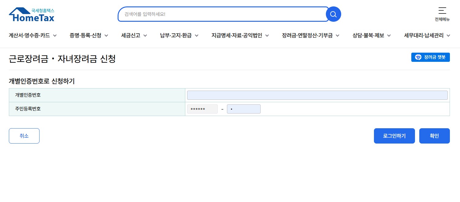 - 홈택스 로그인 후 ‘마이홈택스 → 근로장려금’ 메뉴 클릭