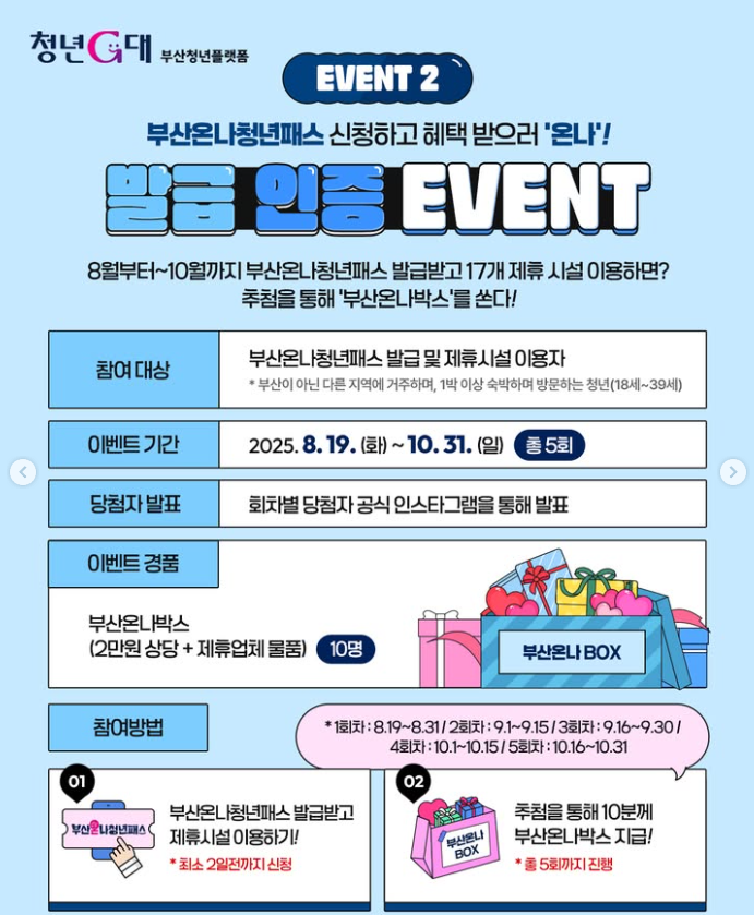 | 청년패스 인증 이벤트 | 8.19 ~ 10.31 | 제휴업체 상품, 기프티콘 등 |